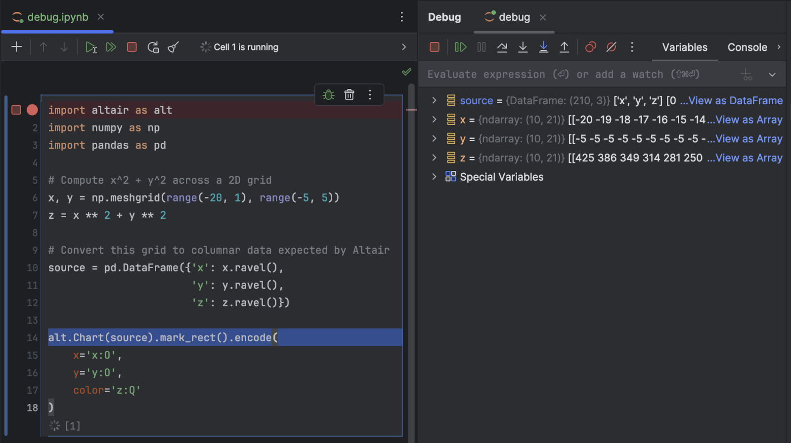 Jupyter Notebook 的 Variables(变量)工具窗口现已支持按名称或类型排序,其中 DataFrame 始终显示在顶部,方便您快速定位并打开大型表数据。