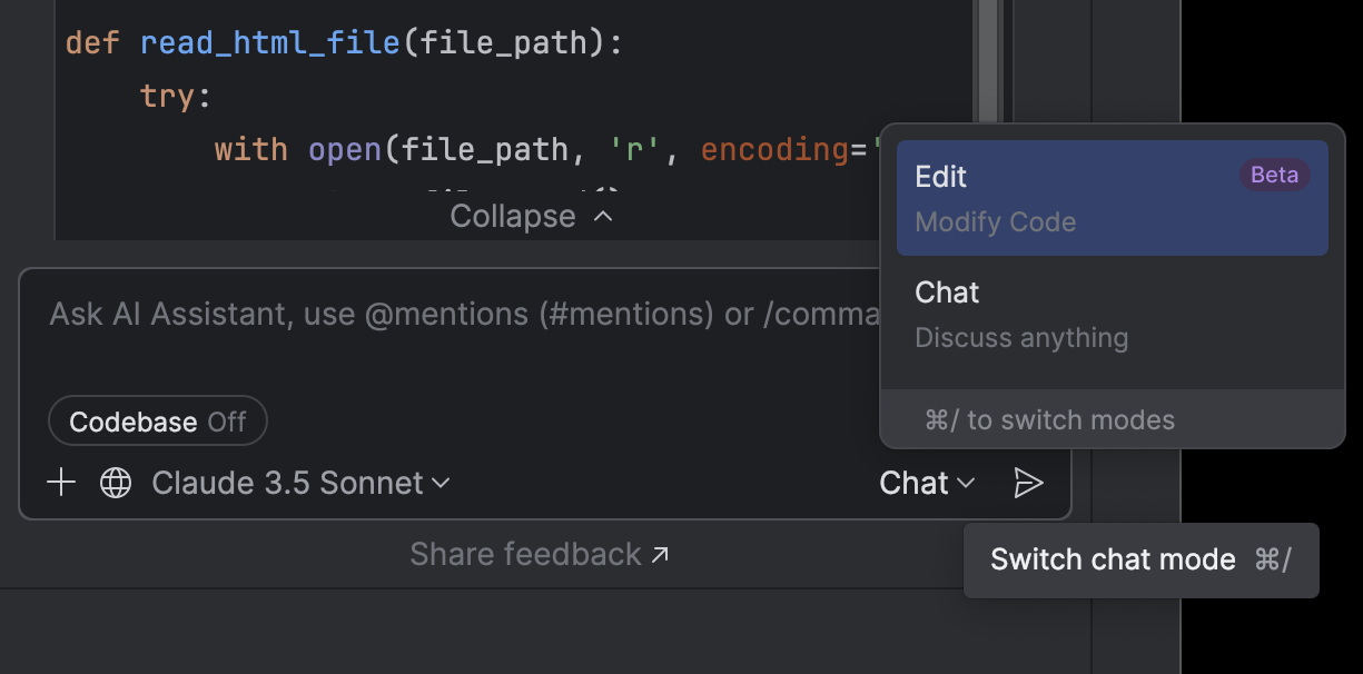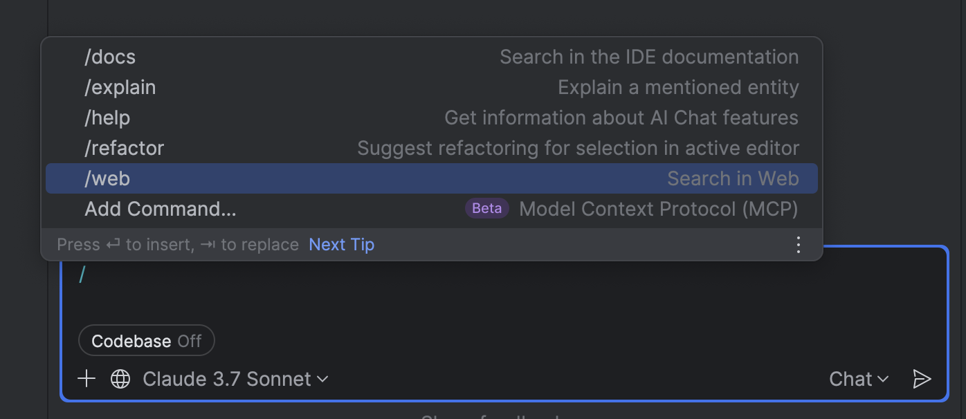 现在,使用任意智能体的最简方式是直接从 AI 聊天中启动;不过,如果您更偏好使用插件,仍可以继续使用 Junie 插件。 部分功能现在仅在插件中提供(例如,针对高资源消耗任务的提醒),而最常用的功能已嵌入到 AI 聊天中。