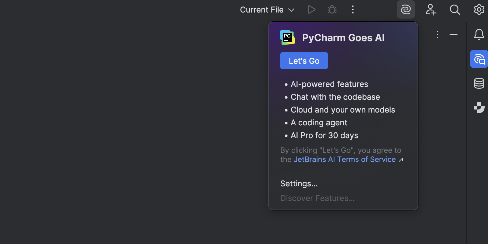 正如此前公告所述,PyCharm 2025.2 是 Community Edition 的最后一个主要版本。 借助 PyCharm 2025.3,我们 为 Community 用户提供了向统一版 PyCharm 平滑迁移的路径。 统一版将所有功能整合到一款产品中,Community 用户可以继续免费使用 PyCharm,并且现在还能受益于对 Jupyter Notebook 的内置支持。 借助一键启动免费 Pro 试用的选项,您现在可以更轻松地探索 PyCharm 面向数据科学、AI/ML 和 Web 开发的高级功能。