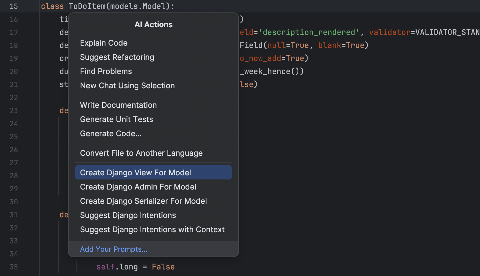 PyCharm 为 Django 提供了一流支持以及一系列功能,可以提高代码质量,同时节省您执行重复任务的时间。 借助 AI Assistant,现在还增加了为现有模型创建视图、admin 和序列化器等 Django 组件的功能。 建议基于您的项目上下文,以确保最相关的结果。