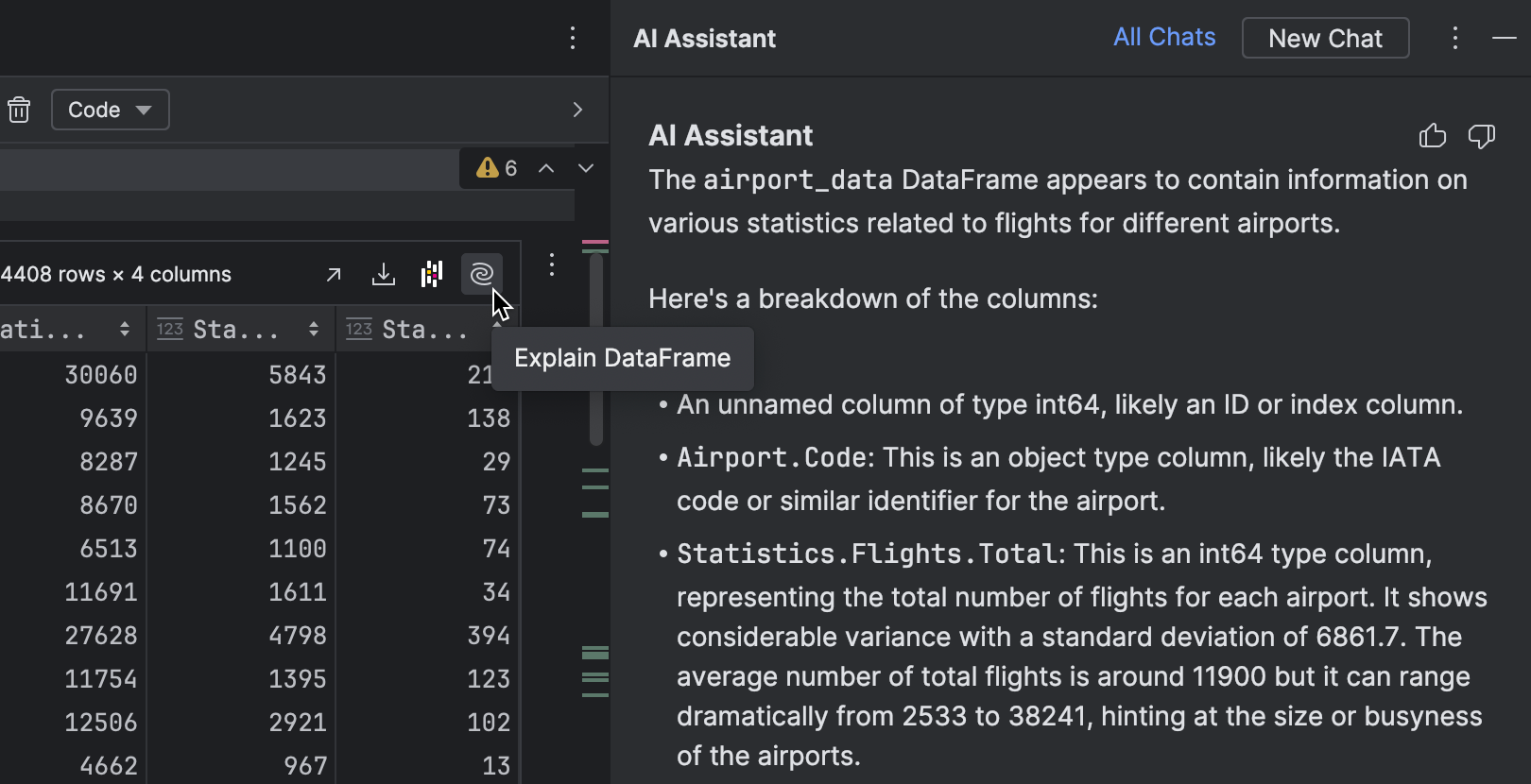 AI Assistant 现在可以让您快速分析 Jupyter Notebook 中 DataFrame 内的数据。