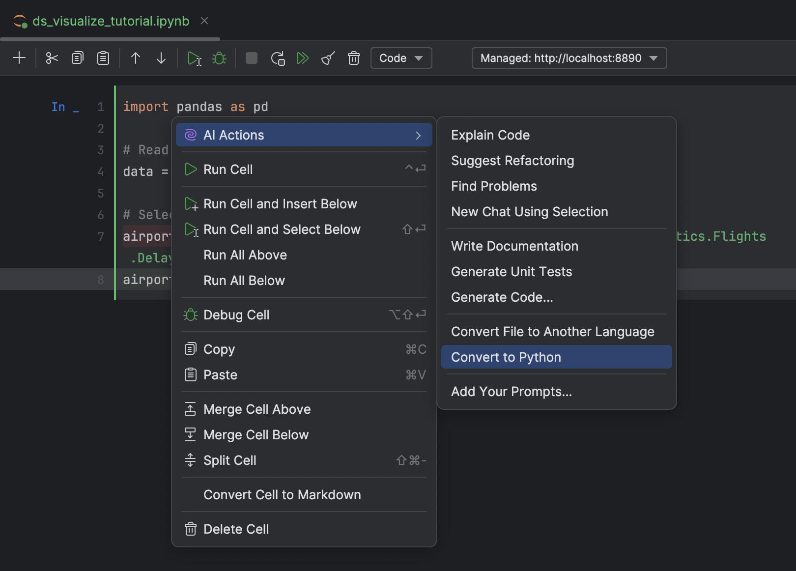 使用 PyCharm 的新 AI Assistant 功能自动将 Jupyter Notebook 转换为 Python 脚本,更快地从实验转向应用程序。