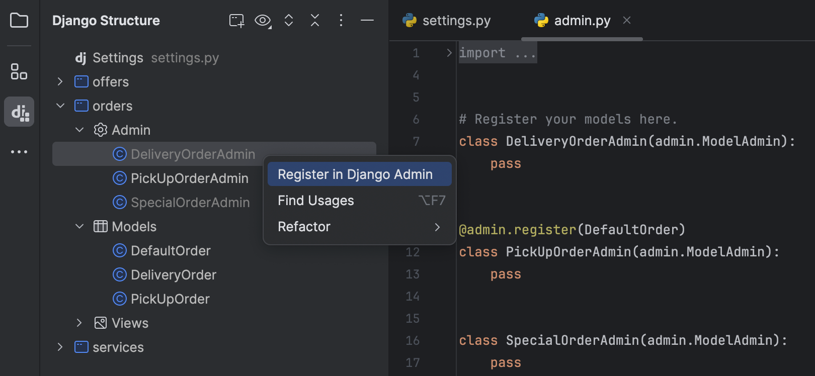 Django Structure(Django 结构)视图现在可以帮助您识别未注册的 admin 并快速注册,无需离开工具窗口。