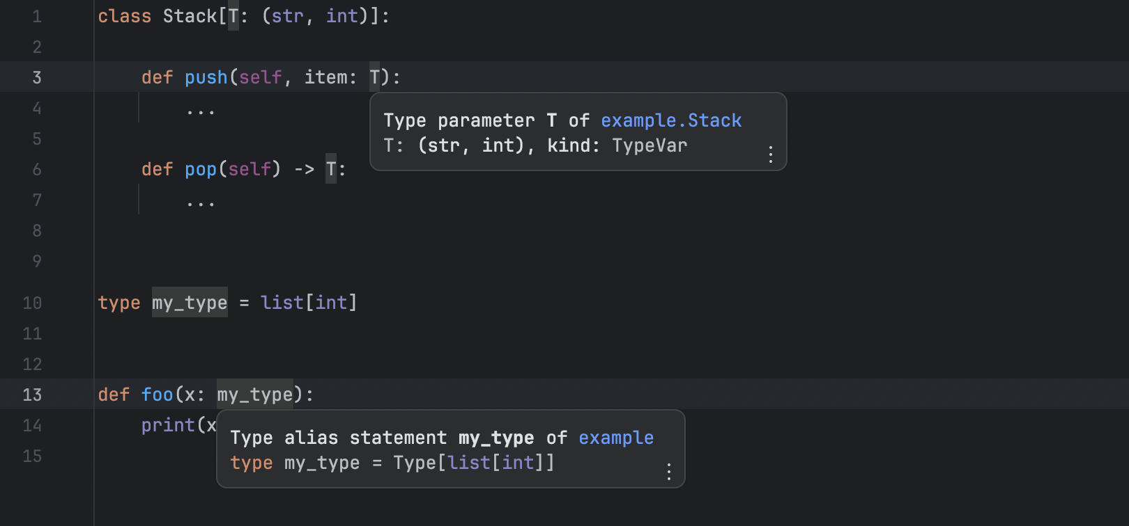 如果您或您的团队已经采用了 PEP 695 中引入的新型类型形参声明语法,那么此功能定会让您的工作更加轻松。 Quick Documentation(快速文档)弹出窗口清楚解释了代码中使用的类型形参和类型别名, 并包含类型形参或类型别名的所有者、类型形参的边界与类型以及类型别名的指定类型的相关信息。