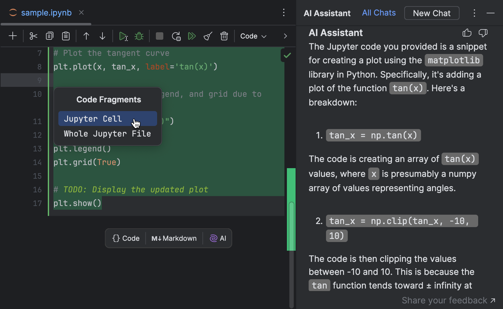 AI Assistant 现在可以使用整个 Notebook 作为上下文,更准确地解释 Jupyter 单元中的代码。