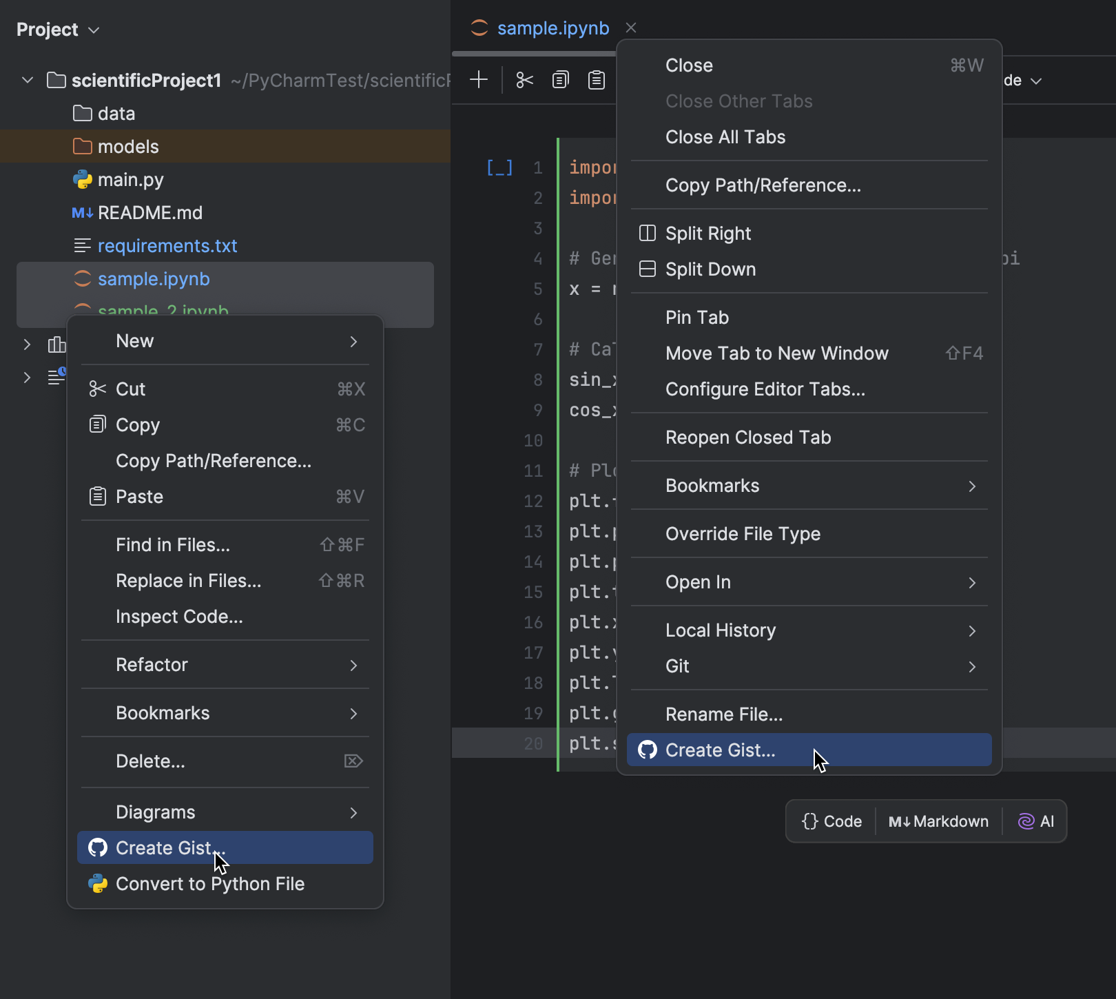 GitHub gist 是一种非常方便的 Notebook 共享方式,现在 PyCharm 提供完全支持。 要从 Notebook 创建 gist,请右键点击编辑器中的标签页,然后从上下文菜单中选择 Create Gist(创建 Gist)。 或者,您也可以在 Project(项目)工具窗口中选择多个文件并一次性共享。