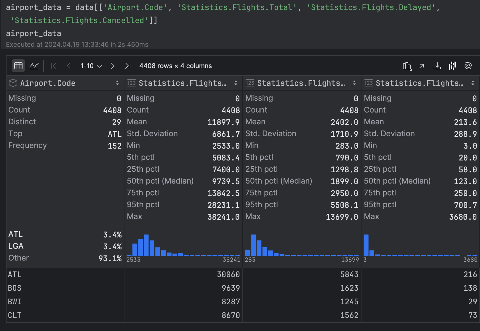您可以直接在 Jupyter Notebook 和 Python 脚本的页眉中快速查看 DataFrame 的基本统计信息。 此外,直方图现已集成到页眉,为数据分布提供即时可视化概览。 这项功能默认处于禁用状态,要启用,请点击 DataFrame 右上角的直方图图标,然后选择 Compact(紧凑)或 Detailed(详细)统计视图。