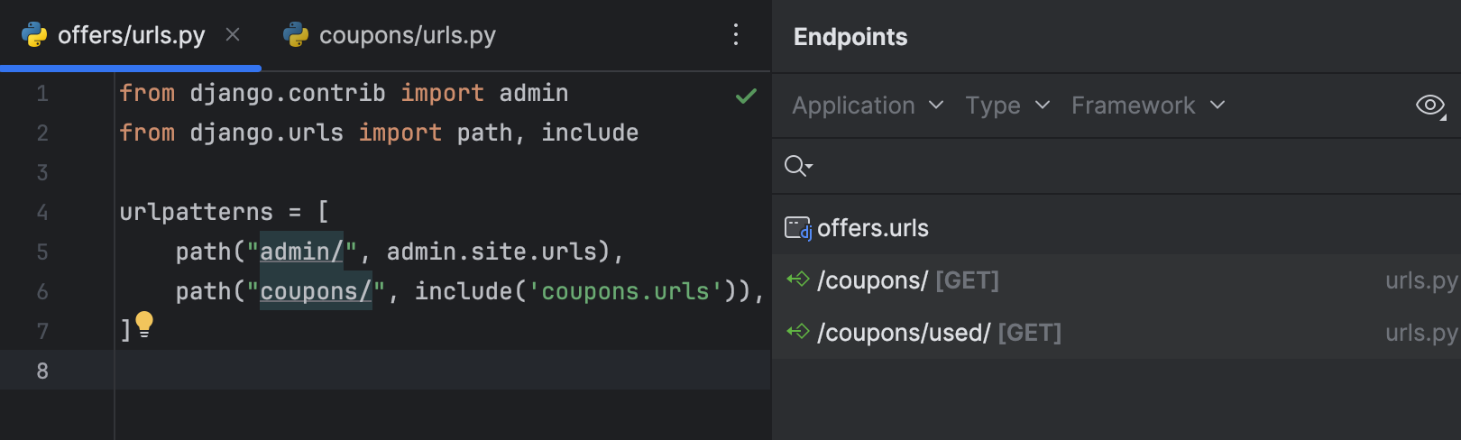 PyCharm 的 Endpoints(端点)工具窗口现在可以识别 Django 项目的路由系统中使用的 include() 并显示端点路由。