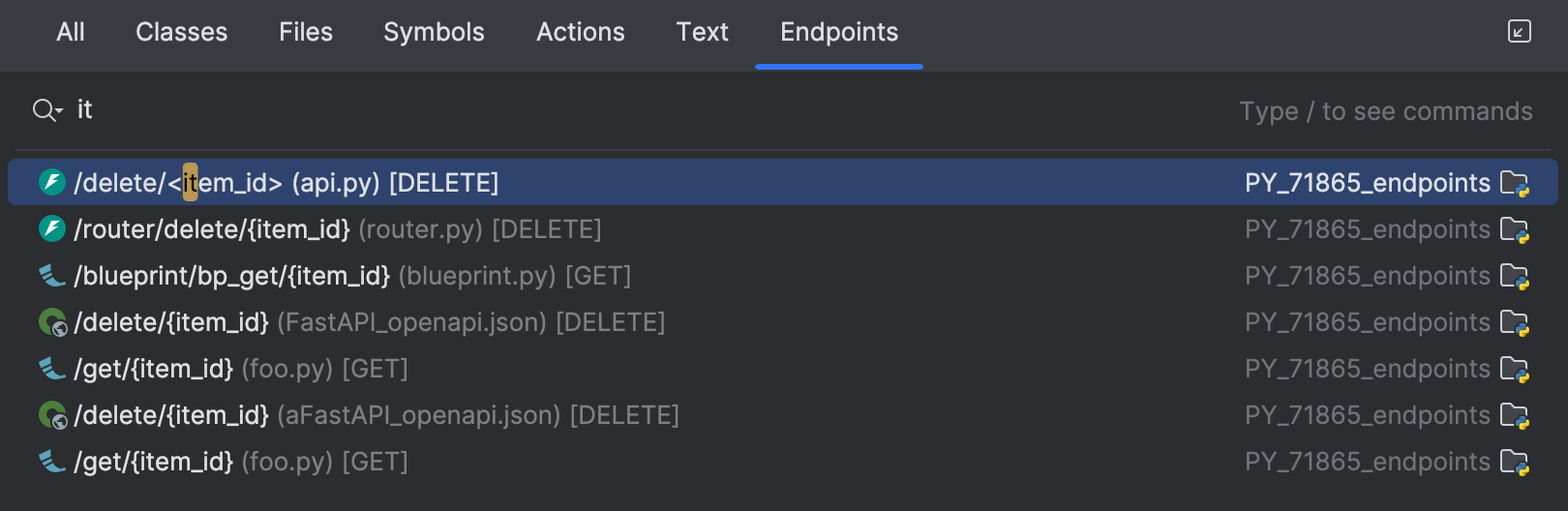 Search Everywhere(随处搜索)对话框现在具有一个专属 Endpoints(端点)标签页。 输入 URL,然后从列表选择需要的端点即可。