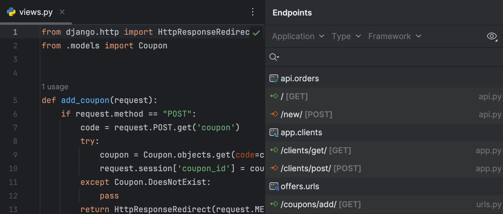 2023 年 Django 开发者调查结果表明,33% 的 Django 开发者也在其项目中使用 Flask 和 FastAPI。 为了提高工作效率,PyCharm 现在按 Web 应用程序将端点分组。