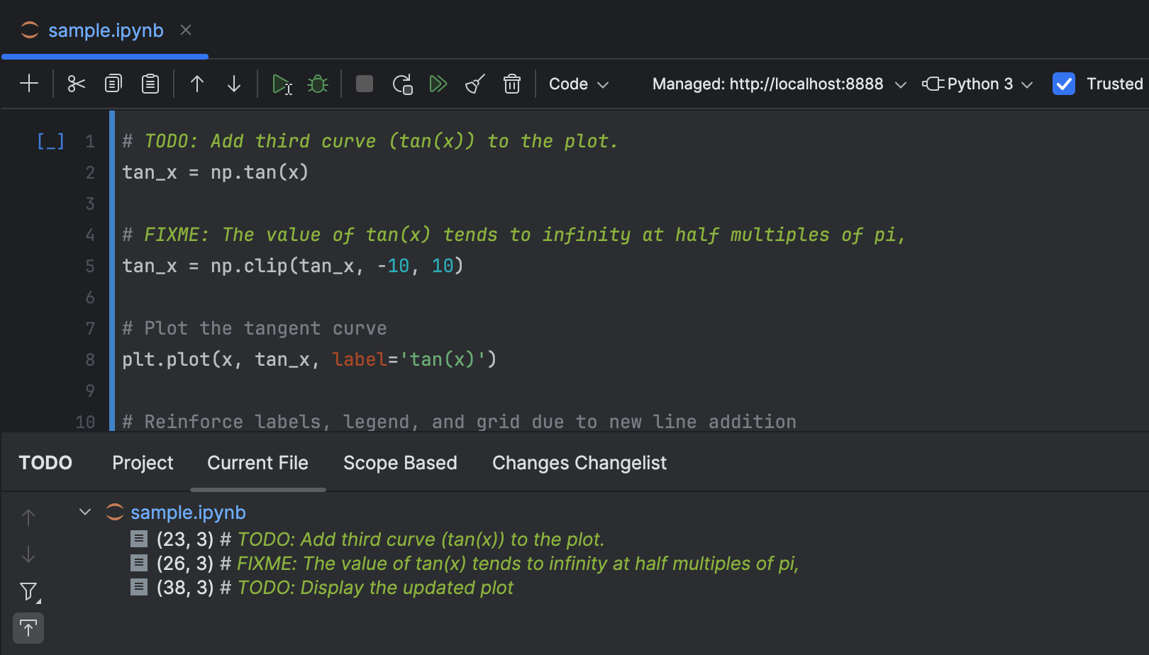 TODO 和 FIXME 注释的高亮显示 PyCharm 现在可以识别并高亮显示 Jupyter Notebook 中的 TODO 和 FIXME 注释,并将其添加到 TODO 工具窗口,以便您可以随时知晓下一步安排。