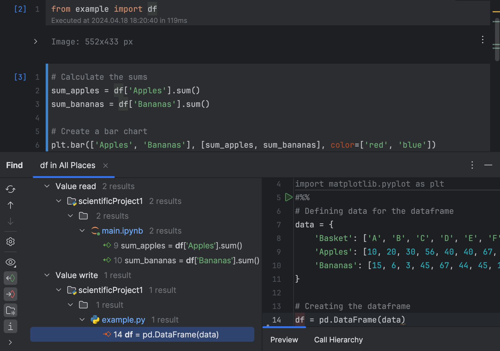 这项备受期待的功能使得在 PyCharm 中使用 Notebook 就像处理 Python 文件一样简单。 查找声明和用法,使用 Rename(重命名)重构,并从全套可用代码检查中受益。