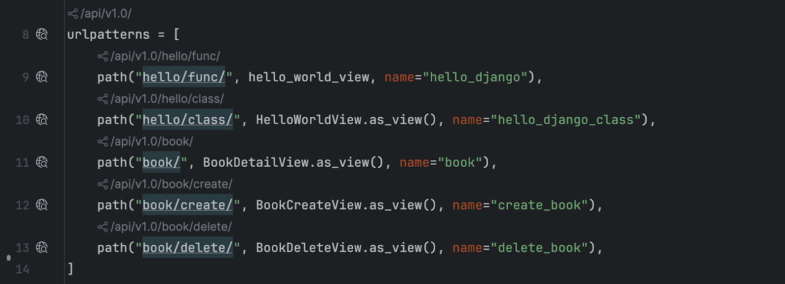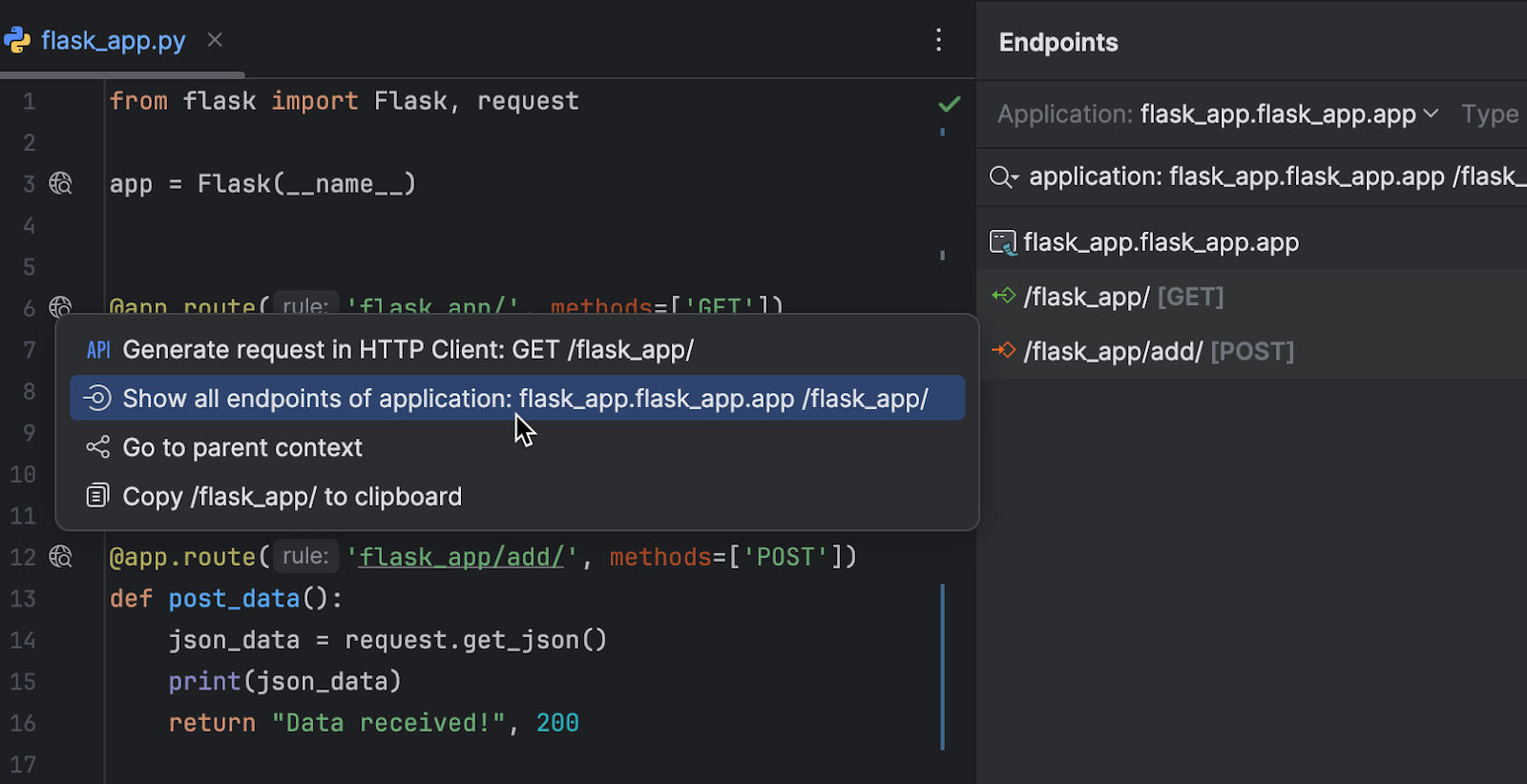 新的装订区域图标可用于轻松管理 Flask、FastAPI 和 Django 项目中的 URL。 只需点击几下,您就可以在 HTTP 客户端中运行请求来测试端点、查看所有较低级别的端点、向上导航一级或将 URL 复制到剪贴板。