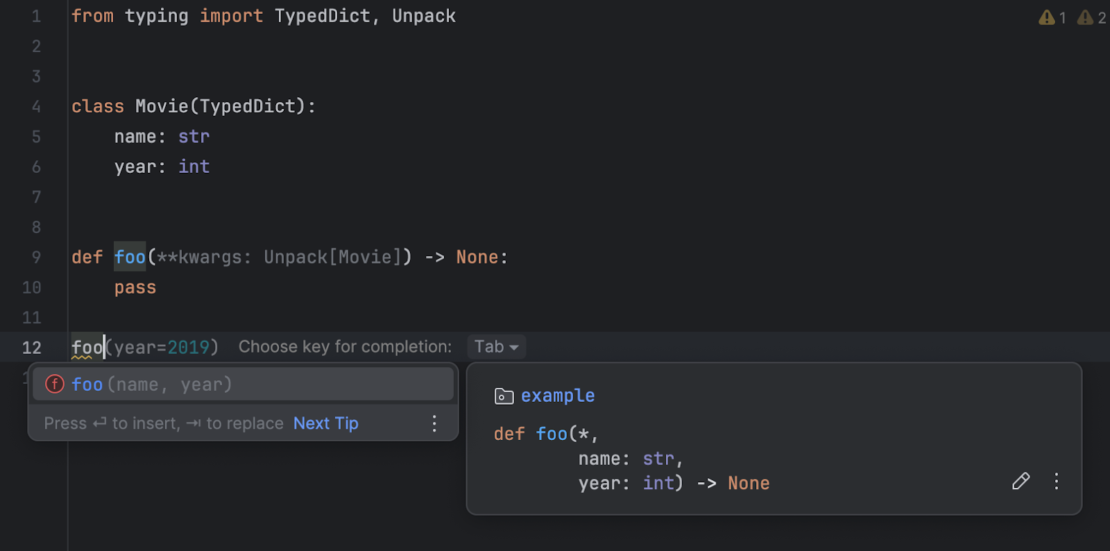 我们增加了对 PEP 692 的支持。 现在,调用形参信息 (Ctrl + P) 时,以及在代码补全和快速文档弹出窗口 (Ctrl + Q) 中,您可以使用定义为 TypedDict 的关键字实参。 另外还有一个工具可让您使用 Python 中最新的类型提示功能开发易于理解的代码库。