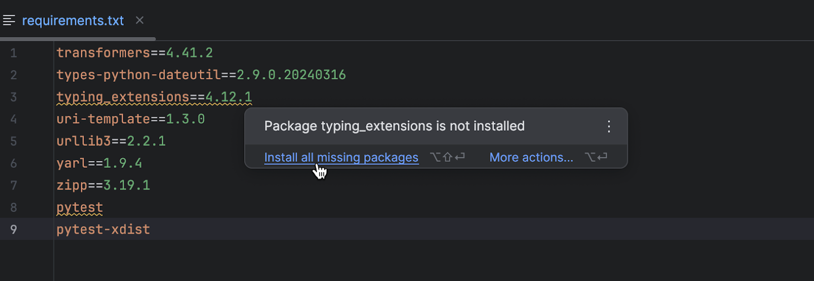 现在,PyCharm 使用黄色波浪线强调在 requirements.txt 中列出但未安装在当前 Python 解释器上的软件包。 将鼠标悬停在软件包名称上,然后点击 Install all missing packages(安装所有缺少的软件包)可以快速设置开发环境。