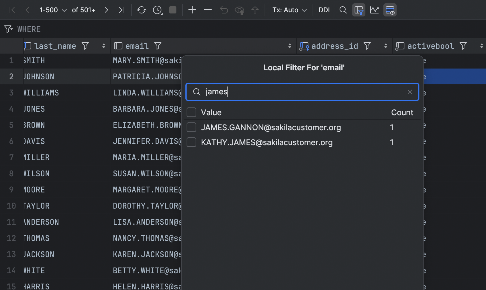 现在,您可以直接在当前页面上按列值快速筛选行,无需等待查询运行。 这种本地方式仅适用于可见页面,但如果需要扩大作用域,您可以更改页面大小或提取所有数据。 要禁用当前数据编辑器中的所有本地筛选器,只需切换 Enable Local Filter(启用本地筛选器)图标 。