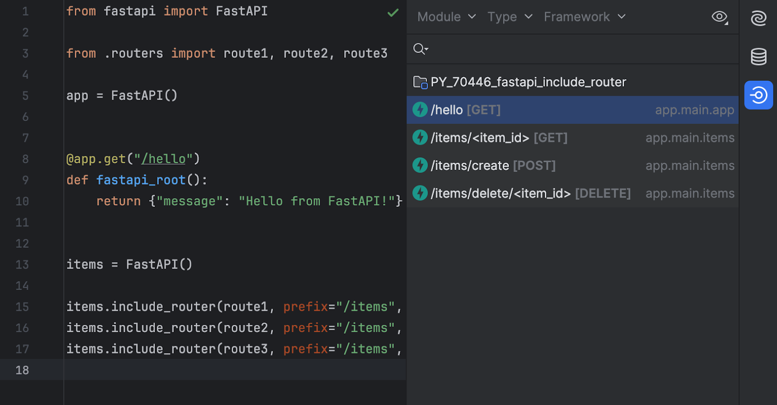 在 PyCharm 2024.1 中开发更大的 Flask 或 FastAPI 应用程序时,您可以查看 Endpoints(端点)工具窗口,清楚了解现有端点及其层次结构,并快速从端点导航到其在项目中的声明 。 使用 Flask 构建的较大应用程序,特别是使用 FastAPI 构建的应用程序,通常具有围绕更精细模块(Flask 中的蓝图和 FastAPI 中的路由器)构建的复杂层次结构。 为了让您清楚了解此类结构并帮助您更快理解其继承,PyCharm 现在按应用将端点分组。 此外,PyCharm 现在能够检测库中声明的端点,以及每个路径的多个端点和不同 HTTP 方法的端点。