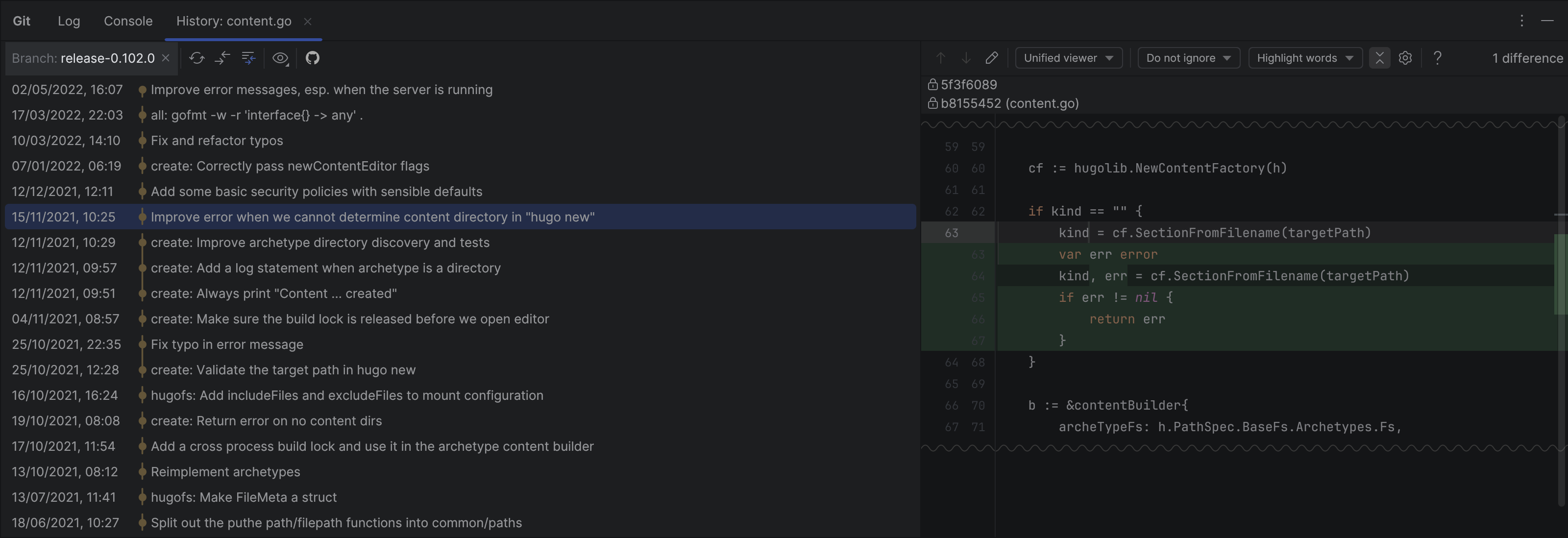 我们改进了 Git 工具窗口中文件历史记录的用户体验。 首先,Show all branches(显示所有分支)按钮已被替换为分支筛选器,允许您审查对指定分支内的文件所做的更改。 我们还调整了工具栏的方向,将其水平放置以提高实用性。