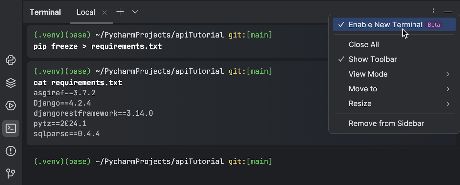 PyCharm 2024.1 重做了终端,包含可视化和功能改进,旨在简化命令行任务。 新终端提供了高级功能,例如便捷的命令导航、提示与输出键盘快捷键切换、命令补全,以及命令历史记录的快速访问。 在此阶段,您的反馈至关重要,我们希望您进行尝试并分享您的想法。 在这篇博文中了解详情。