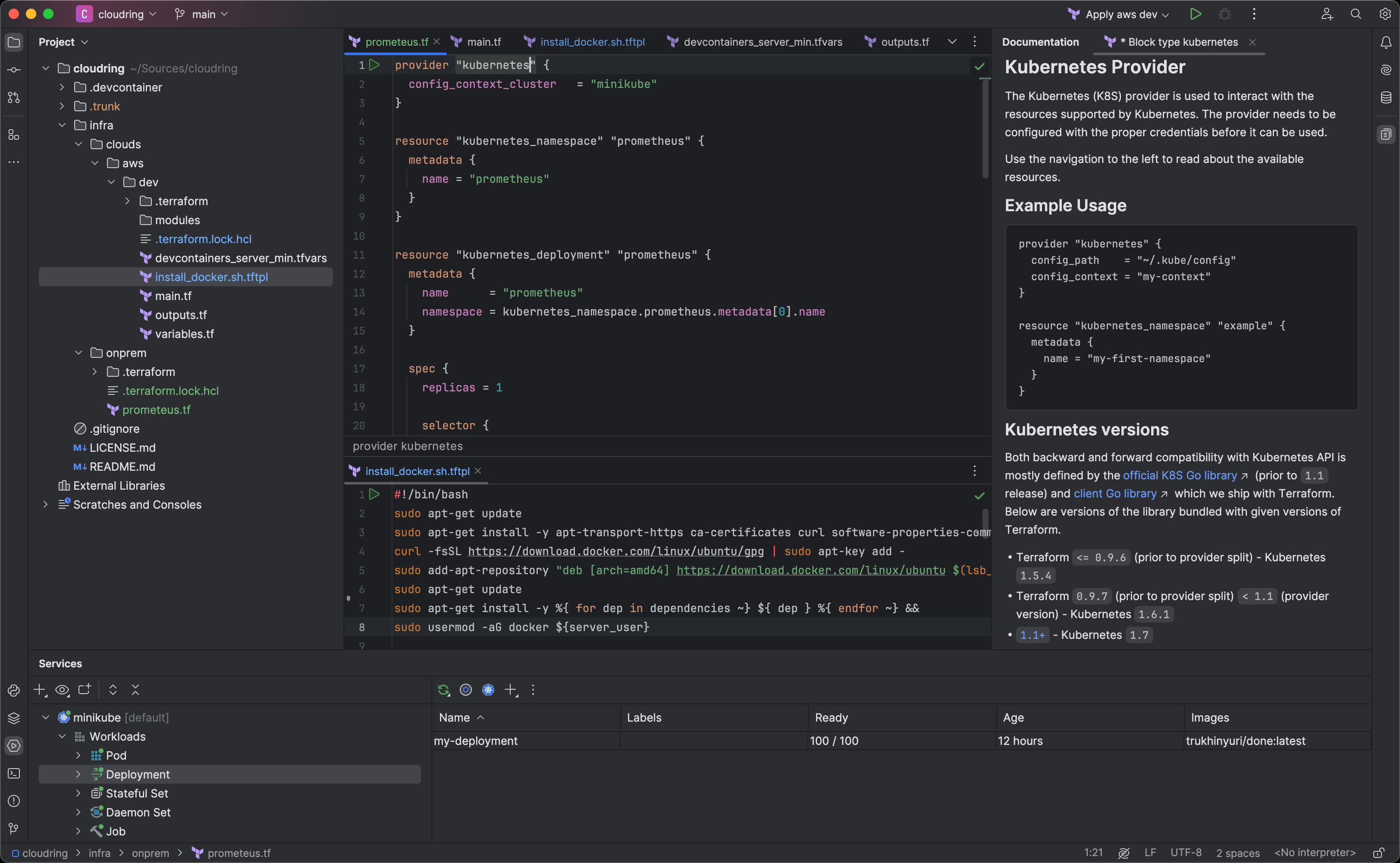 PyCharm 2024.1 带来了改进的 Terraform 支持,有助于简化创建、管理和扩缩基础架构的流程。 现在,IDE 通过明确建议运行 terraform init 来简化初始化,并为超过 3,900 个第三方 Terraform 提供程序提供了扩展的代码补全功能。 此外,IDE 还引入了对 Terraform 模板语言 (tftpl) 的支持,实现动态模板,可以与您的首选编程语言无缝集成。 您可以在我们的博文中找到更多详细信息。