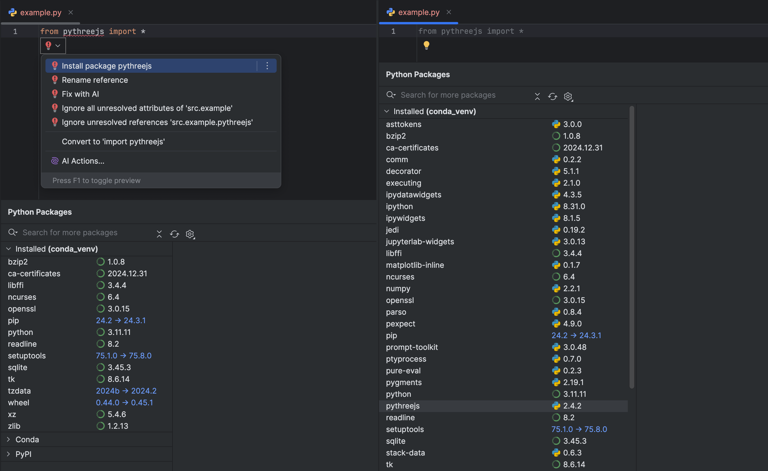 如果软件包在默认的 Conda 仓库中不可用,PyCharm 现在会抛出错误信息,并为您提供从 PyPI 安装缺失的软件包的选项。 用户可以选择 Install from PyPI(从 PyPI 安装)并正常进行,或者如果他们希望采取不同的方式,可以选择 Abort Installation(中止安装)。