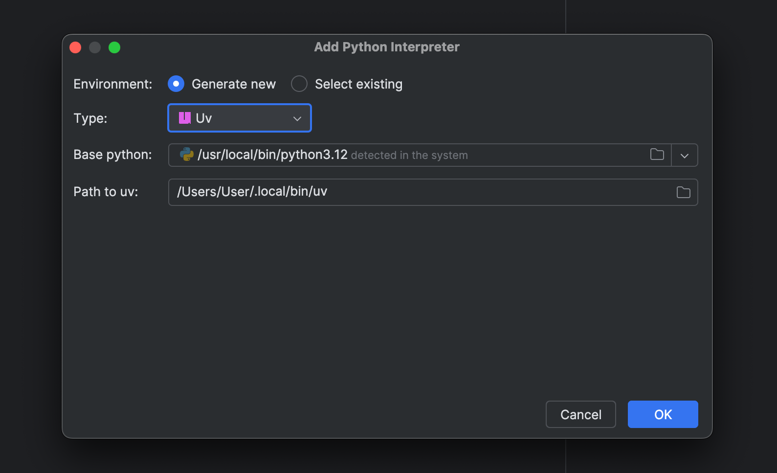 借助 PyCharm 中的 uv 集成,将您的环境管理提升到新水平。 从头创建新环境或使用新的环境类型选项将 uv 应用于现有环境。 此外,在从 VCS 导入项目时,可以灵活选择 venv 和 uv 作为您的虚拟环境管理器。