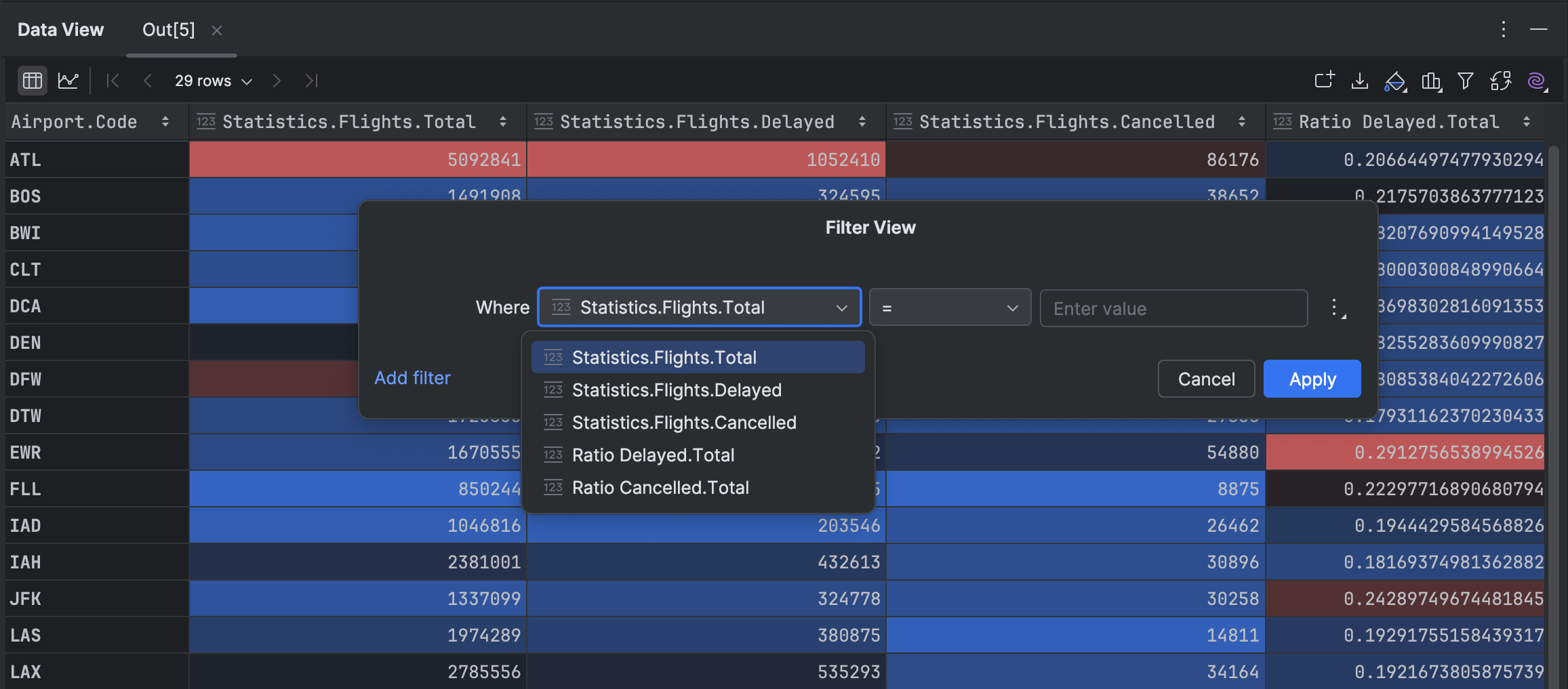 现在,您无需编写任何代码即可在 Data View(数据视图)工具窗口和 DataFrame 中筛选数据。 点击位于工具窗口或 DataFrame 右上角的 Filter(筛选)图标,然后选择想要使用的筛选选项。 筛选结果在同一窗口中即时显示。