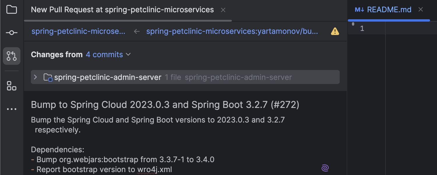 现在,AI Assistant 可以帮助您直接从 IDE 为拉取与合并请求生成准确的标题和描述,从而简化您的工作流并确保您的描述清晰直观。