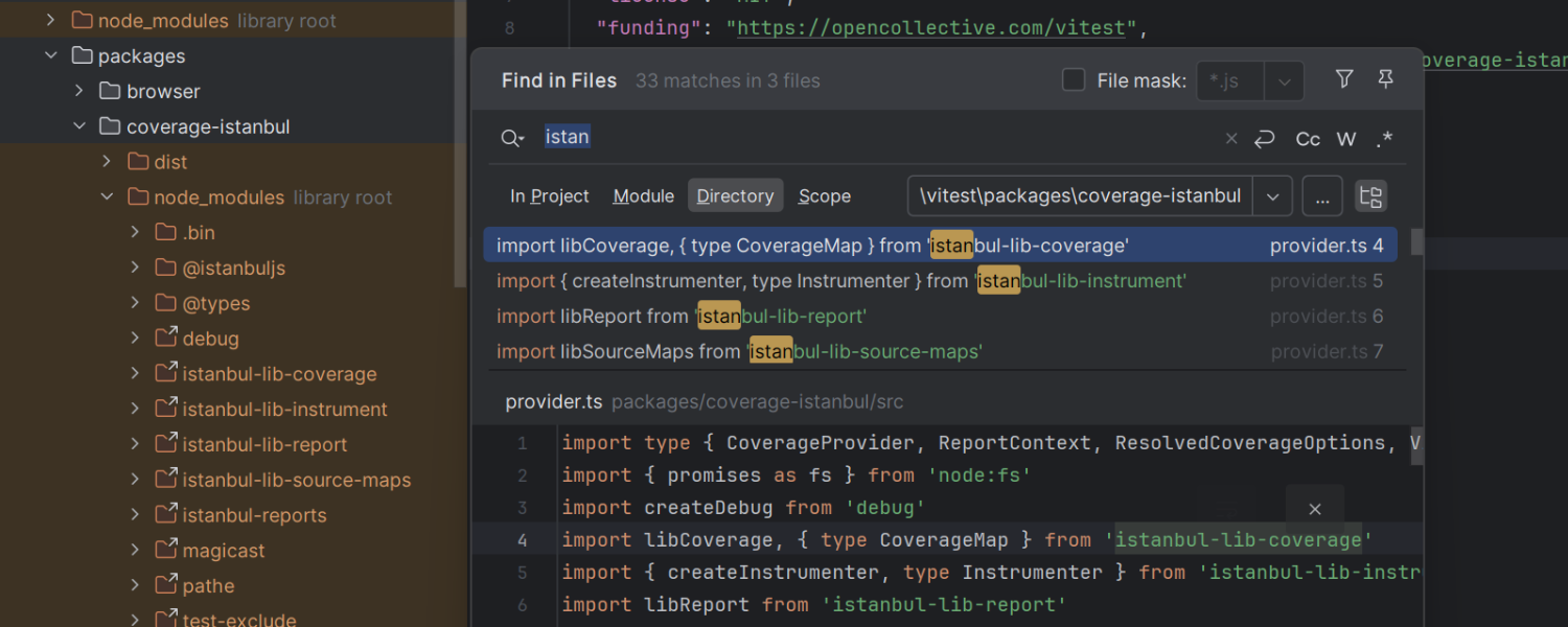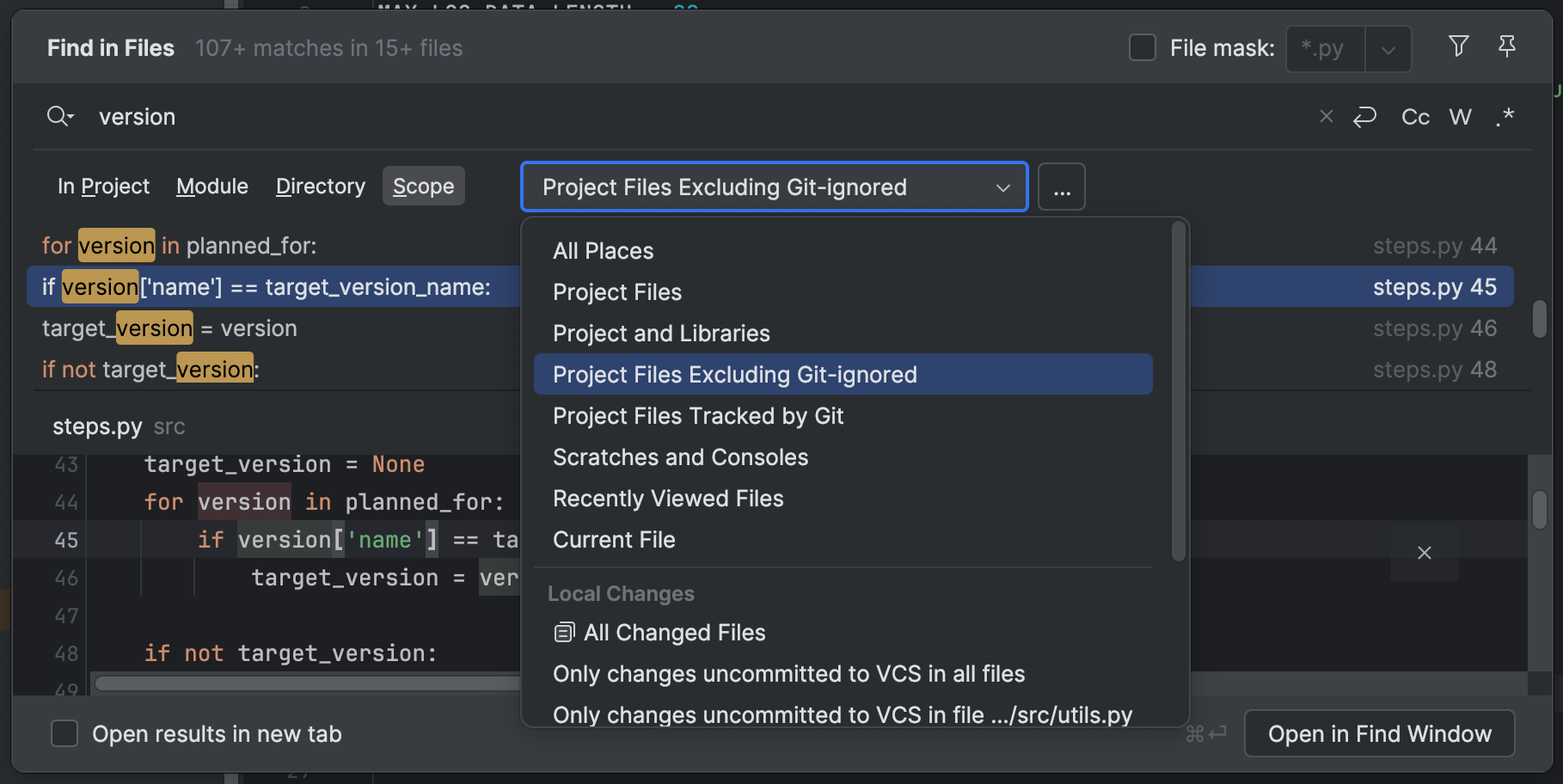 Find in Files(在文件中查找)功能得到增强,增加了新的搜索范围 Project Files Excluding Git-Ignored(项目文件,不包括 Git 忽略的文件)。 此选项将从搜索结果中排除 .gitignore 文件中忽略的任意文件,帮助您在项目中搜索时只关注相关代码。