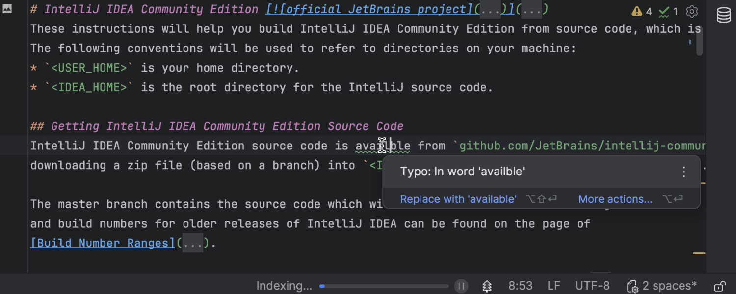 基于 2024.2 版本取得的进展,我们增加了项目模型构建和索引编制期间可用的关键功能的数量。 在 2024.3 版本中,拼写和语法检查在索引编制期间也可运行。 这样,您无需等待索引编制完成即可捕获错误,例如 Markdown 文档和文档标记中的错误。