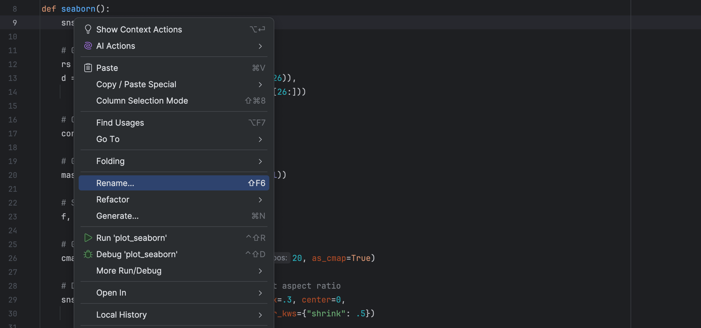 我们优化了 Rename(重命名)操作在编辑器和 Project(项目)工具窗口中的元素上调用时在上下文菜单中的位置。 此操作现在位于顶层,方便经常使用鼠标的用户快速重命名文件、变量和其他元素。