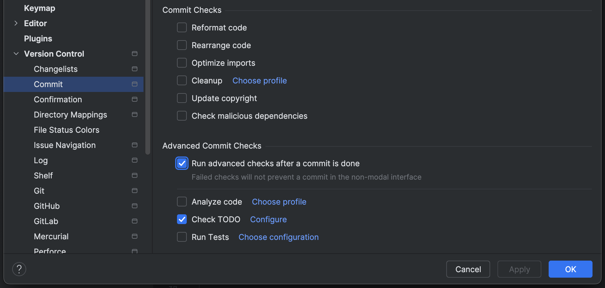 现在,您可以使用 Settings | Version Control | Commit(设置 | 版本控制 | 提交)下的新选项 Run advanced checks after a commit is done(提交完成后运行高级检查)在提交过程中管理后台检查。 通过此设置,您可以决定是否在提交后运行测试和检查。 如果您希望在提交之前完成这些检查,将其禁用即可。
