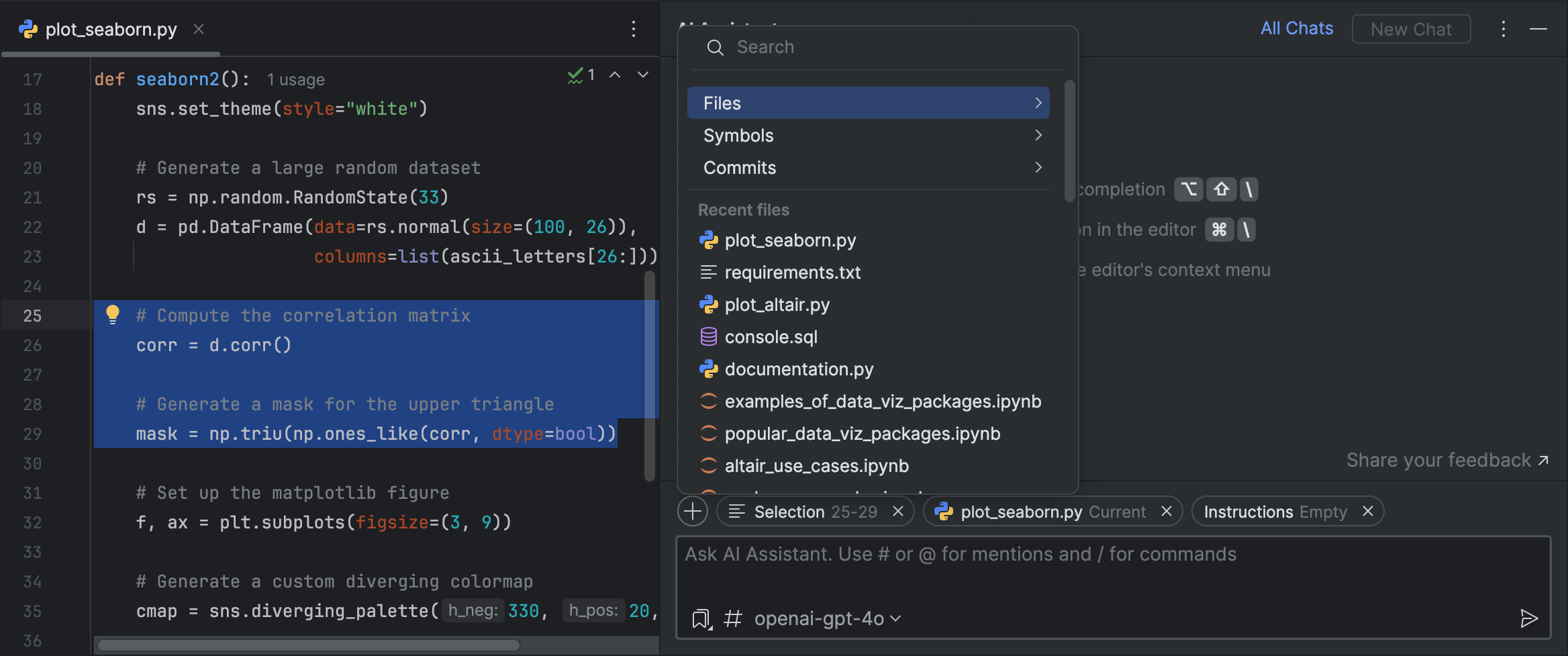 在 Python 控制台中运行来自 AI 聊天的代码段,更快地迭代 AI Assistant 建议的代码。 点击代码段右上角绿色的 Run(运行)按钮,查看建议的代码段如何运作。