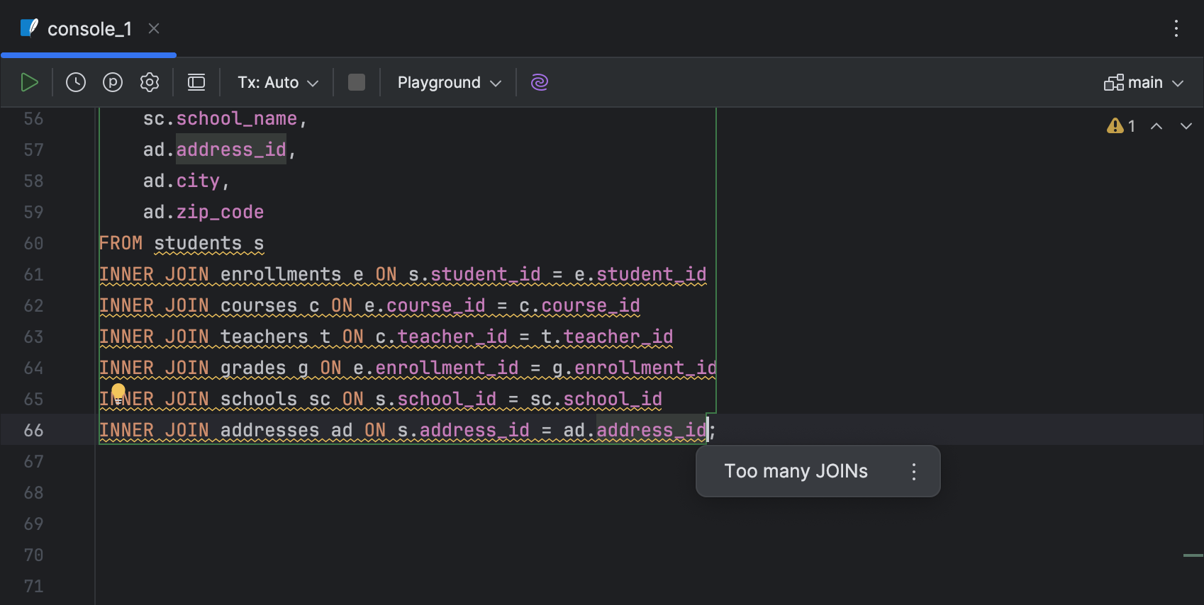 JOIN 子句数量是否过多的检查 在某些情况下,不建议运行包含过多 JOIN 子句的查询,因为这会降低性能。 编辑器现在可以识别并高亮显示此类查询。 您可以在 IDE 设置中启用此检查。 为此,导航到 Editor | Inspections(编辑器 | 检查),展开 SQL 部分,然后选择 Excessive JOIN count(JOIN 计数过多)。