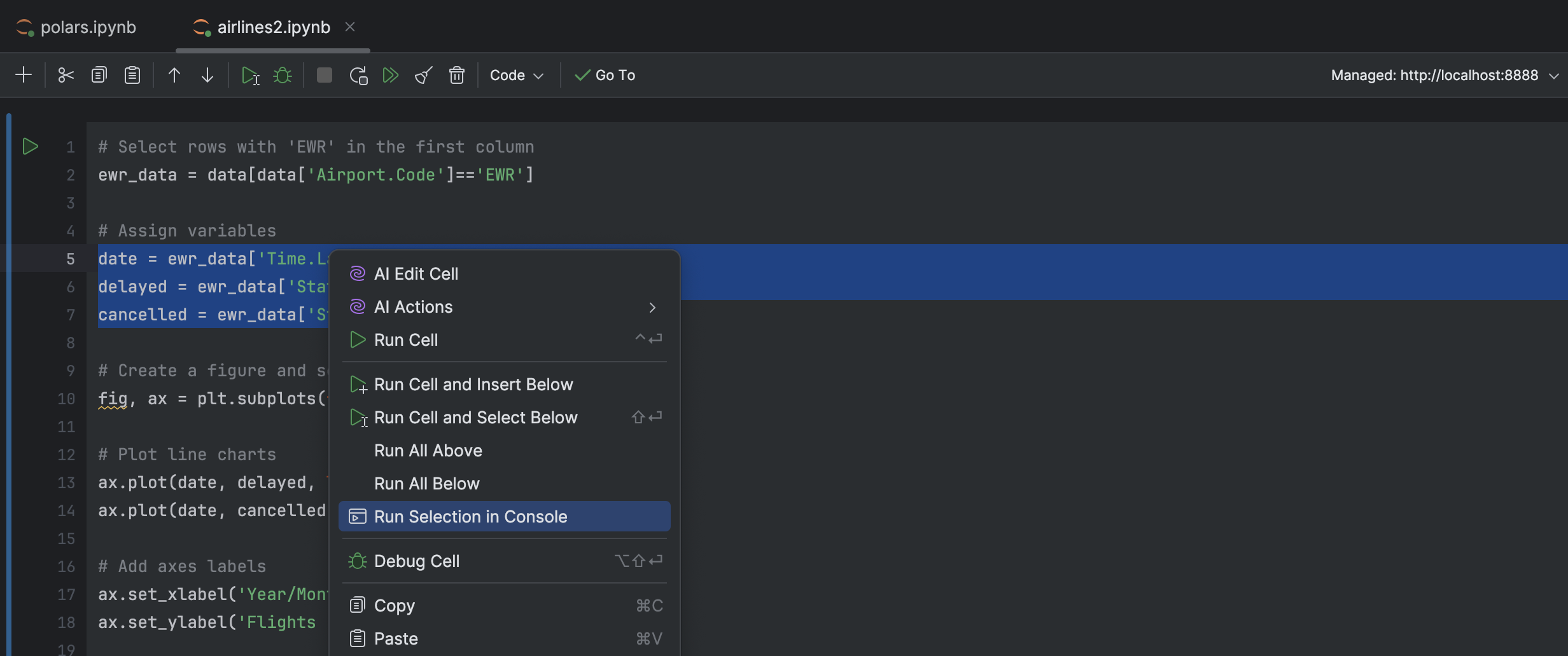 PyCharm 现在允许您直接在 Jupyter 控制台中运行所选代码行,无需执行整个单元。 此功能可让您轻松快速地调试或检查特定代码段的输出,有助于提高工作流的灵活性和效率。
