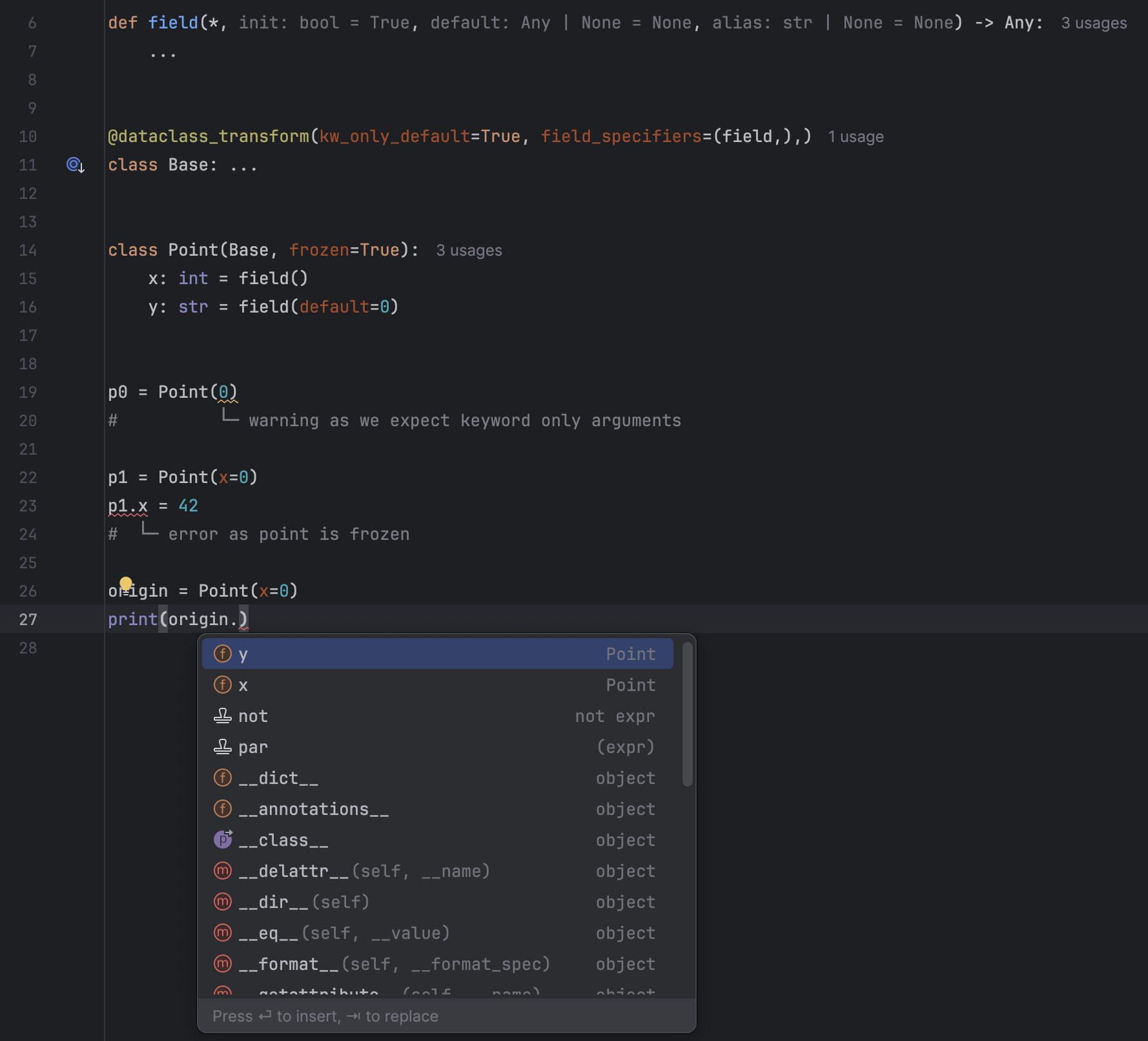 当您处理通过使用 dataclass_transform 装饰器的库创建的自定义数据类时,IDE 现在能够为您提供与标准数据类相同的智能编码辅助。 例如,您可以获得针对特性的代码补全以及针对构造函数签名的类型推断。