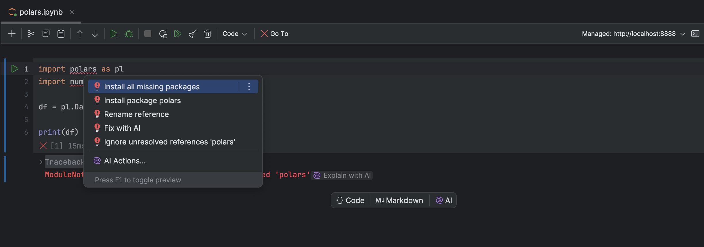 借助 PyCharm 2024.3,您可以更轻松地安装代码中导入的软件包。 可以使用一项新的快速修复进行批量自动安装,一键下载并安装多个软件包。