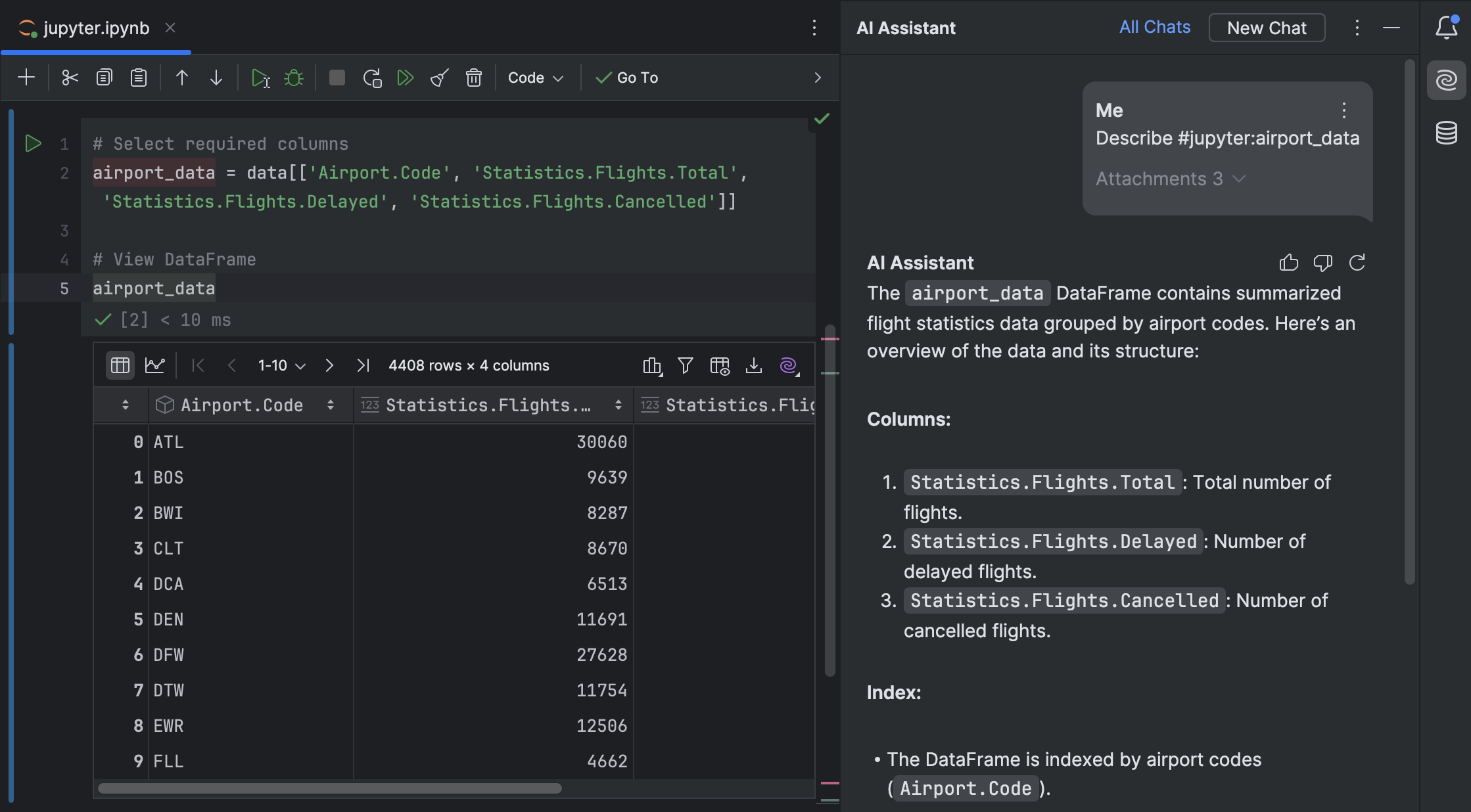 AI Assistant 现在能够处理 Notebook 中的 DataFrame 和变量。 只需在 DataFrame 或变量的名称前加上 #,AI Assistant 就会帮助您进行分析。 AI Assistant 可以直接访问 DataFrame 的摘要和统计信息,因此能够为您提供最理想的结果。