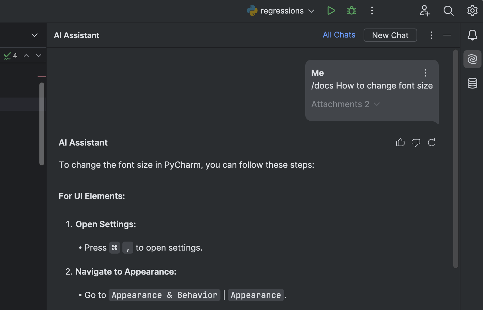 现在,AI Assistant 可以根据 PyCharm 文档的最新状态建议在 PyCharm 中执行给定任务的最佳方式。 使用 /docs 命令可以获取有关如何最有效完成任务的定制提示。