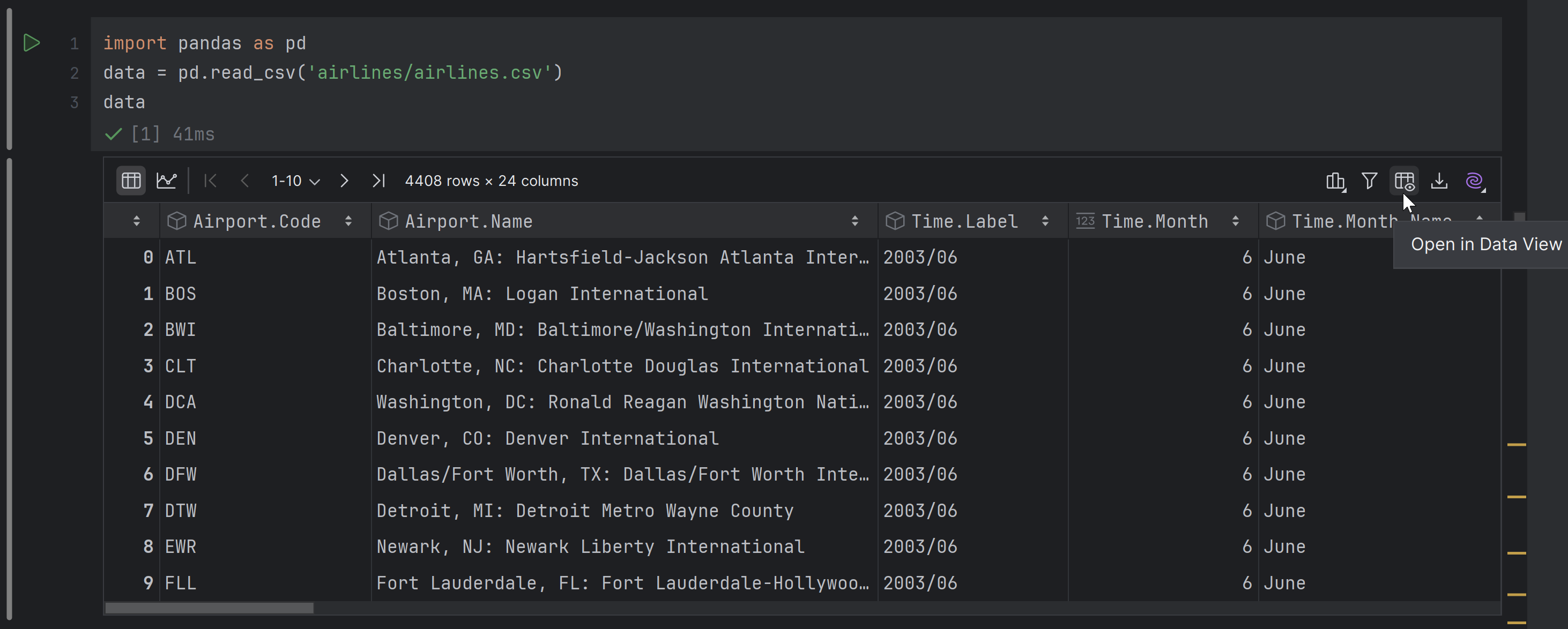在 Data View(数据视图)工具窗口中查看 Jupyter 表输出,访问热图、格式设置、切片和 AI 功能等强大功能,增强 DataFrame 分析。 点击 Open in Data View(在数据视图中打开)图标即可开始。
