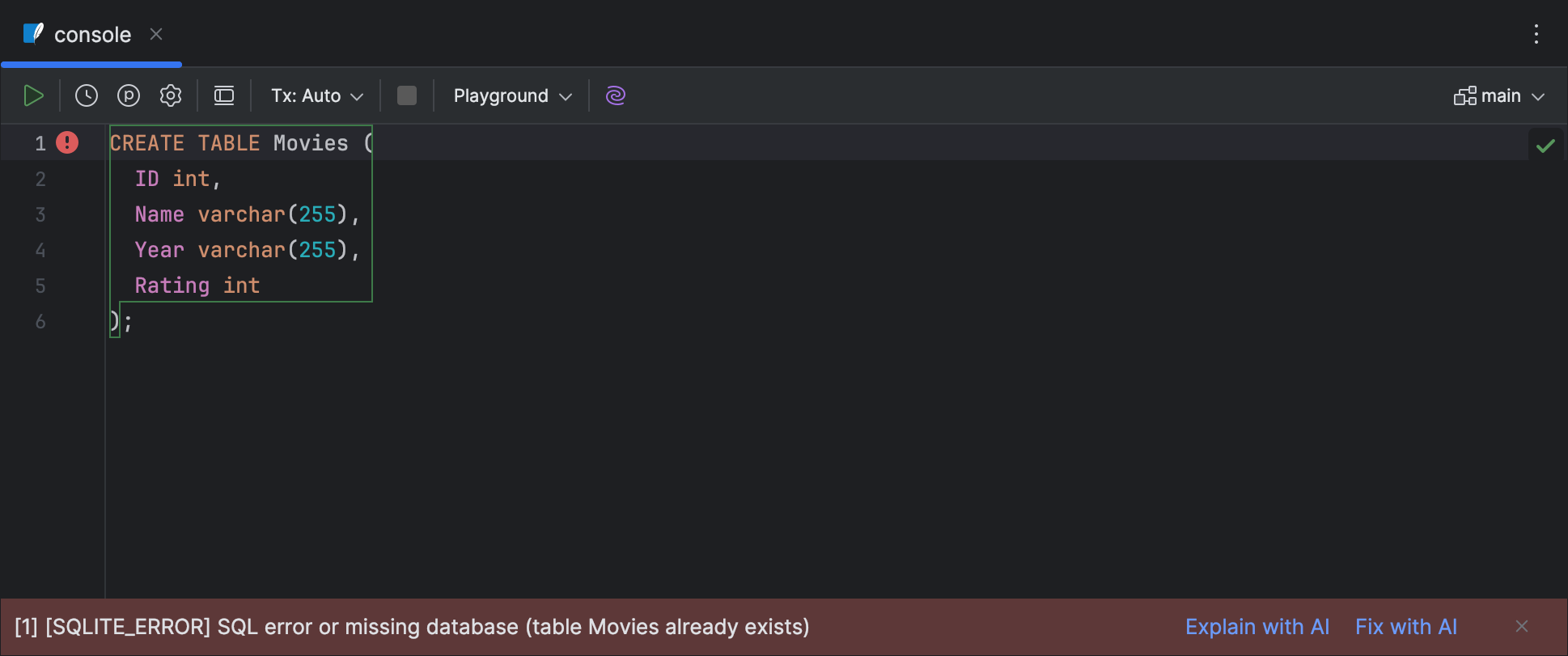 我们为通过 AI Assistant 处理 SQL 查询执行错误实现了一些实用操作。 现在,对于每条错误消息,PyCharm 都会在错误消息的最右侧显示两个操作:Explain with AI(使用 AI 解释)和 Fix with AI(使用 AI 修正)。