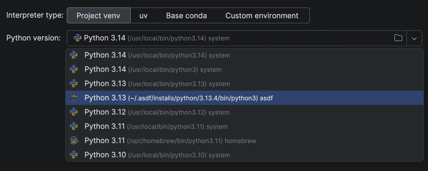 此外,在设置环境时,您现在只需从列表中选择一个 Python 版本即可,uv 会使用对应的系统版本,或为您下载并管理合适的版本。