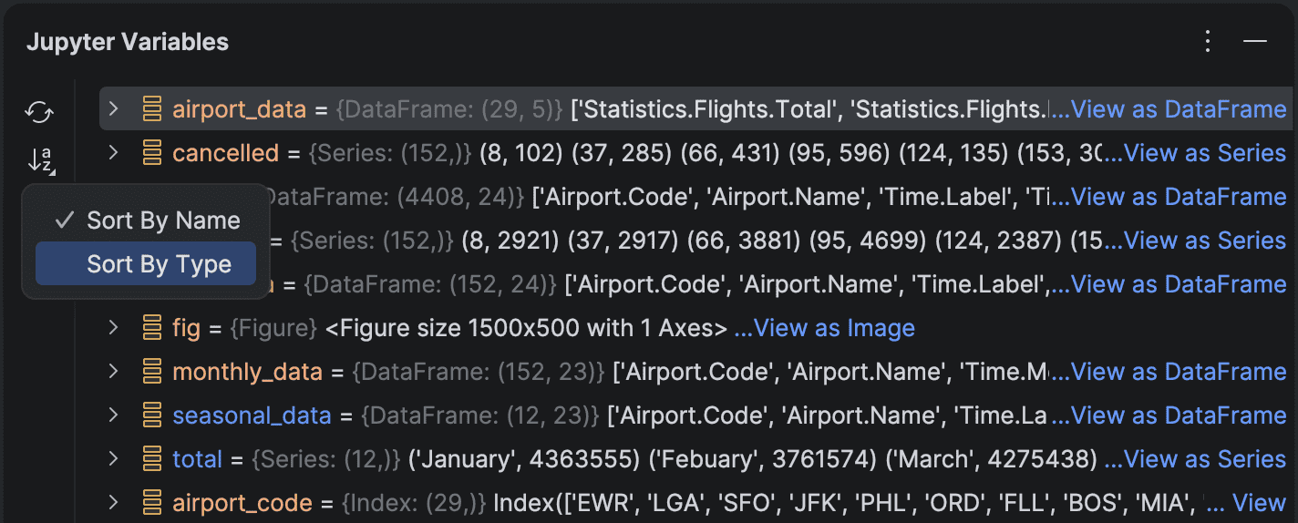Jupyter Notebook 的 Variables(变量)工具窗口现已支持按名称或类型排序,其中 DataFrame 始终显示在顶部,方便您快速定位并打开大型表数据。