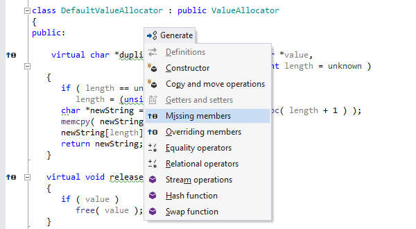 ReSharper C++ 提供了一种快速的方法来生成缺失的成员、重写成员、等式或关系运算符、基于现有声明的定义、哈希与交换函数和构造函数。