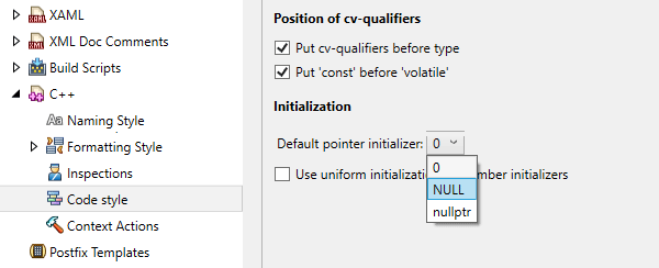 ReSharper C++ 还可以让您定义团队编码标准的其他部分,例如修饰符的顺序和指针初始值设定项的首选值。 例如,您可以指定 0、nullptr 或 NULL 作为首选初始值设定项样式,ReSharper C++ 在为您生成新的初始值设定项时会尊重您的选择。