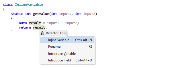ReSharper C++ 提供了多个全功能主流重构,例如 Rename、Extract Method 和 Change Signature。 此外,它还提供了许多上下文操作,只需一个快捷键即可完成局部代码转换。