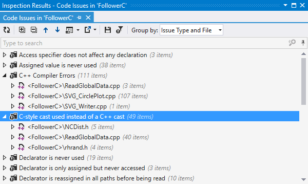 在结果就绪后,您可以按照多个条件对它们进行分组以及通过搜索来查找特定类型的问题。 您还可以保存和加载 Find Code Issues 结果的报告。