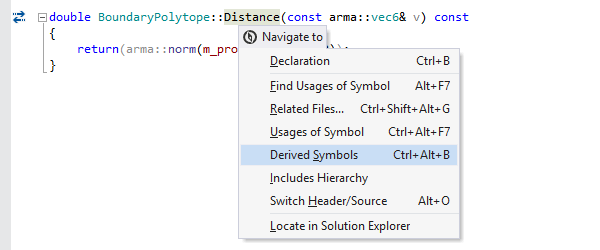 ReSharper C++ 中其他可感知上下文的导航选项包括从选定的符号导航到它的用法、基本符号或派生符号。