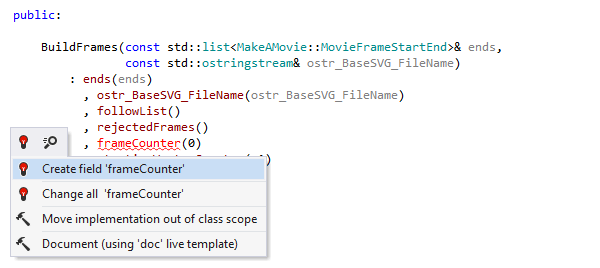 快速修复的另一个好处是,您可以先使用类、方法、变量、属性和字段,然后再声明它们。 检测到未声明的符号时,ReSharper C++ 会建议快速修复,根据符号用法生成对应的符号声明。