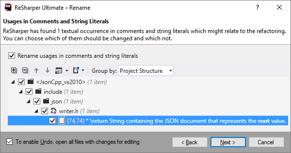 除了应用于实际代码符号外,Rename 重构还可以重命名相关文件(源文件和头文件)与注释和文档中的相关文档,以及在 #include 指令中更新用法。